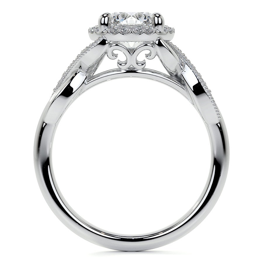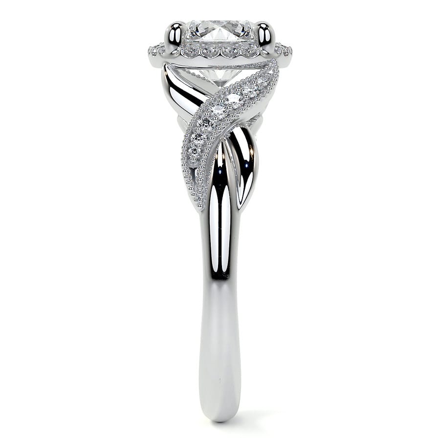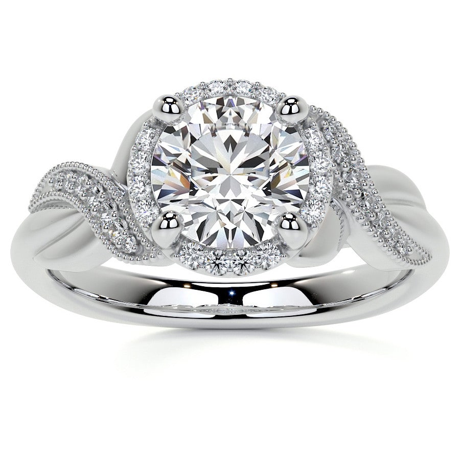This stunning engagement ring features a brilliant round cut lab grown diamond, encircled by a dazzling halo of smaller diamonds. Its intricate twisted pave band, adorned with delicate milgrain detailing, creates a captivating and artful design inspired by nature's elegance. A perfect symbol of enduring love, blending classic sparkle with unique, flowing aesthetics.