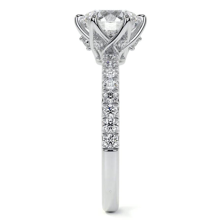 This exquisite engagement ring features a stunning round brilliant cut lab grown diamond, radiating with exceptional sparkle. The elegant pave band, adorned with smaller diamonds, perfectly complements the timeless beauty of the center stone, creating a look of refined brilliance.