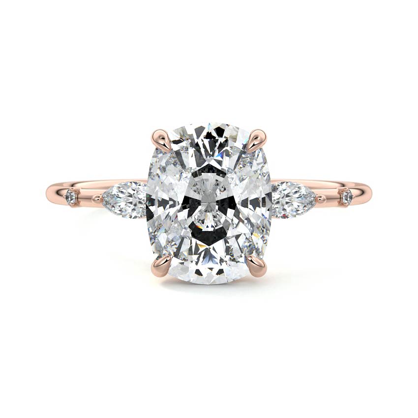 Showcasing a brilliant elongated cushion cut lab grown diamond as its centerpiece, this exquisite ring is flanked by two sparkling pear-shaped diamonds. Further accent stones adorn the delicate band, creating a design of captivating elegance and modern sophistication.