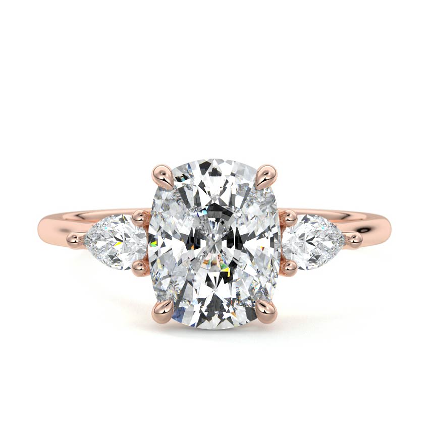 This exquisite three stone engagement ring features a stunning Cushion cut lab grown diamond at its heart, flanked by two brilliant Pear cut side stones. The elegant combination creates a dazzling display of light, promising a lifetime of sophisticated sparkle.