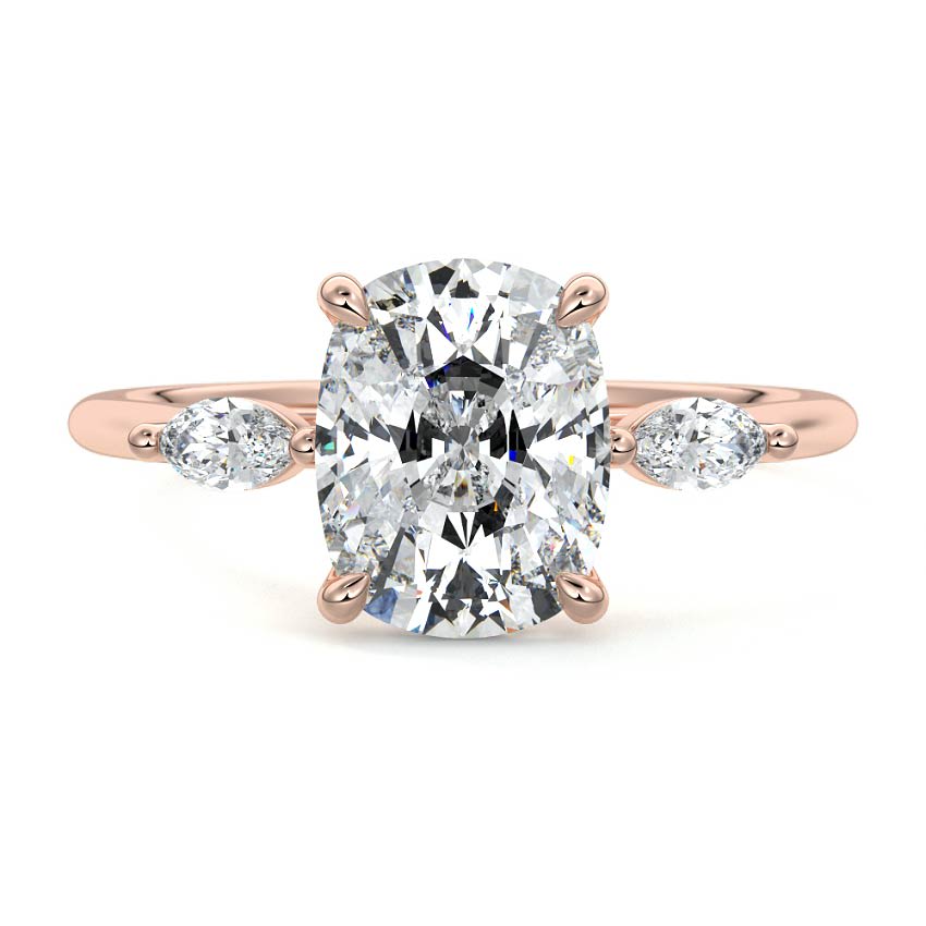This exquisite three stone engagement ring features a stunning rectangular cushion cut lab grown diamond at its heart, beautifully complemented by two elegant pear-shaped side diamonds. Set on a sleek metal band, this ring offers a harmonious blend of classic charm and radiant brilliance.