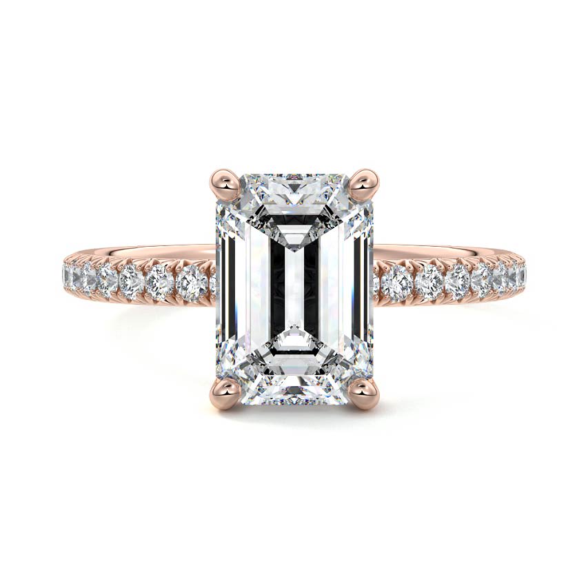 This stunning engagement ring features a magnificent Emerald cut lab grown diamond, renowned for its captivating step-cut facets and elegant rectangular silhouette. The brilliant center stone is perfectly complemented by a delicate pave diamond band, adding an extra layer of sparkle and sophisticated charm.