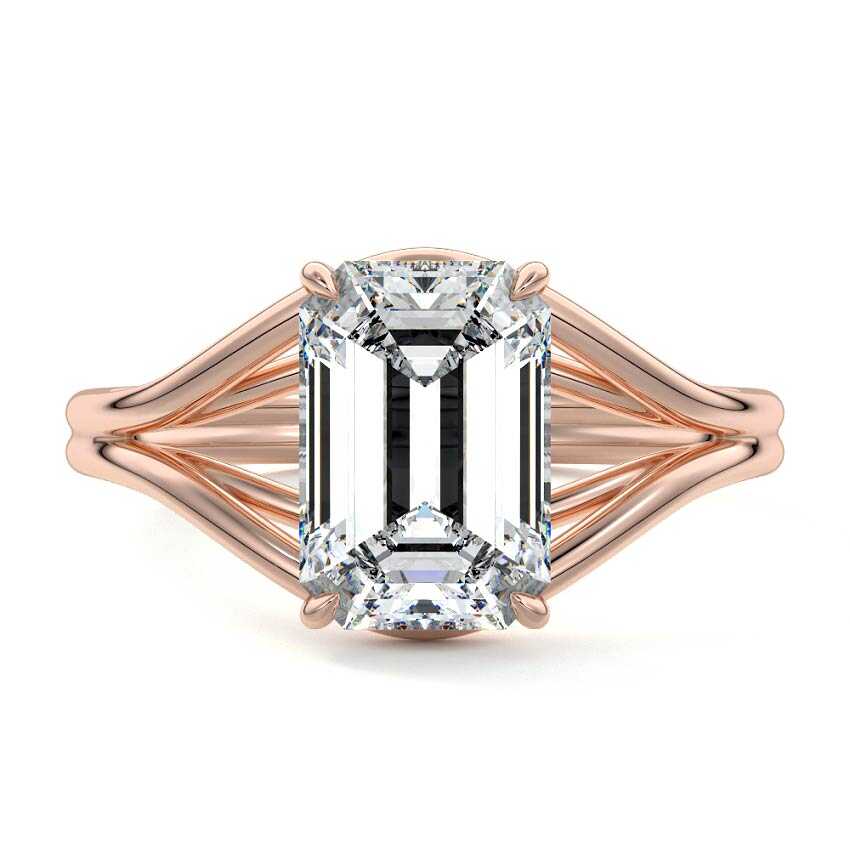 This exquisite engagement ring showcases a captivating Emerald cut lab grown diamond, renowned for its elegant step-cut facets. The unique twisted rose gold band creates a contemporary and graceful silhouette, offering a sophisticated blend of classic allure and modern design.