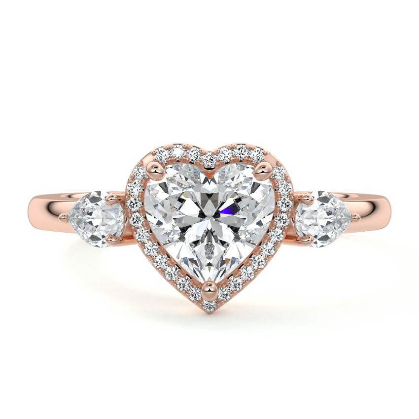This exquisite lab grown diamond engagement ring features a stunning Heart cut center stone, beautifully framed by a sparkling halo. Further enhanced by elegant pear-shaped side stones, it's a radiant symbol of love and commitment.