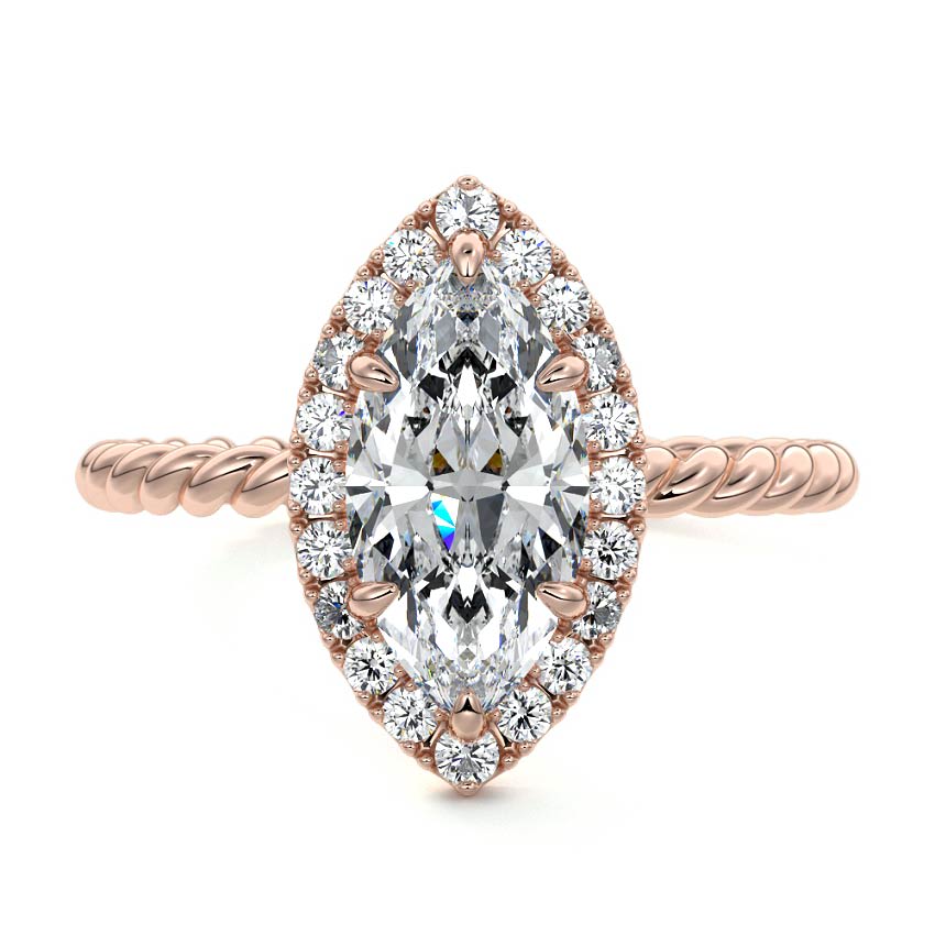 This exquisite engagement ring features a stunning Marquise cut lab grown diamond, elegantly framed by a sparkling halo. The intricate twisted rose gold band adds a unique and romantic touch, making it a truly distinctive piece.