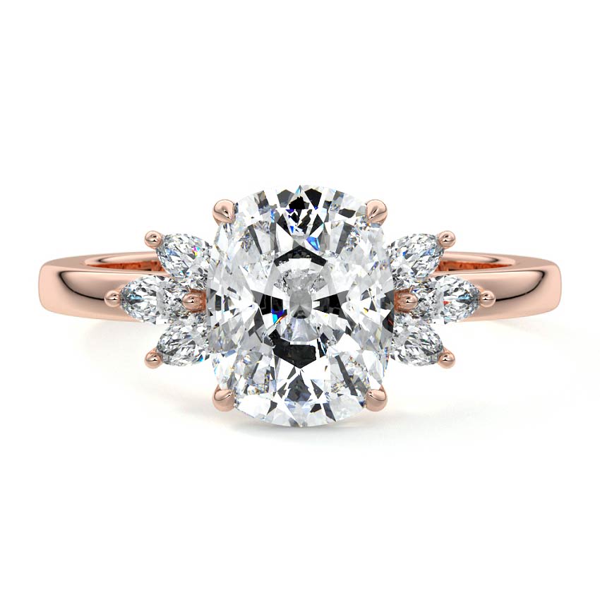 This exquisite engagement ring showcases a captivating oval cut lab grown diamond, beautifully complemented by nature-inspired diamond clusters on either side. The harmonious blend of classic brilliance and organic design creates a truly unique and breathtaking piece.