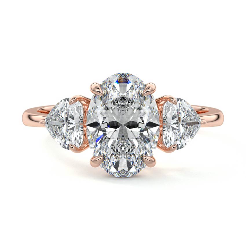 This magnificent ring showcases a brilliant Oval cut lab grown diamond as its captivating center stone, beautifully flanked by two sparkling pear-shaped side diamonds. A classic three-stone design, it symbolizes past, present, and future with unparalleled elegance and radiance.