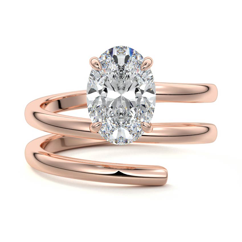 This captivating engagement ring features a stunning Oval cut lab grown diamond, gracefully held by a unique twisted band. Its contemporary design offers a modern twist on classic elegance, perfect for a distinctive statement.