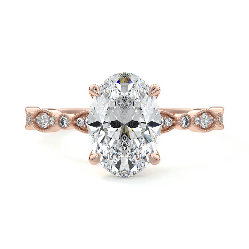 This exquisite vintage-inspired engagement ring features a stunning oval cut lab grown diamond at its heart. Intricate milgrain detailing and delicate sidestones adorn the band, creating a piece that exudes timeless elegance and sophisticated charm.