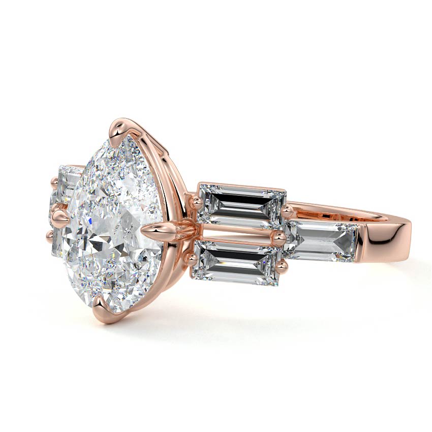 This exquisite engagement ring features a stunning Pear cut lab grown diamond, artfully flanked by a sophisticated arrangement of brilliant baguette side stones. Set in lustrous rose gold, its contemporary yet classic design offers unparalleled elegance and sparkle.