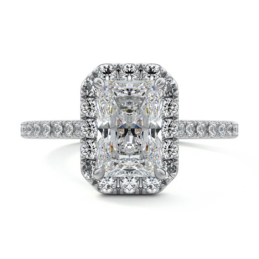 This exquisite engagement ring showcases a stunning Radiant cut lab grown diamond at its heart, renowned for its brilliant sparkle and unique rectangular outline with cropped corners. Encircling the center stone is a dazzling halo of smaller diamonds, gracefully extending onto the pave-set band for continuous brilliance, creating a look of modern elegance.