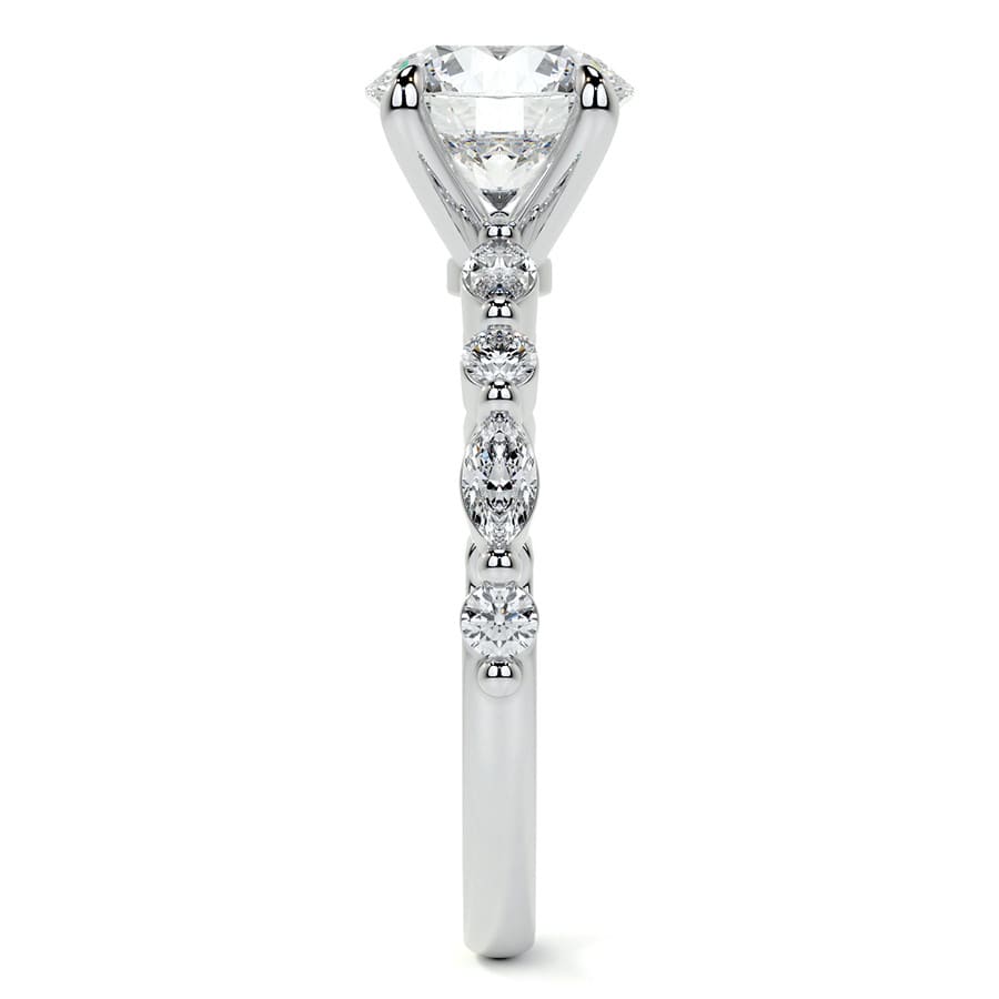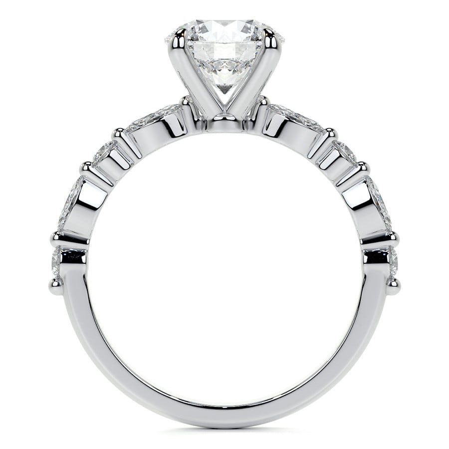 This exquisite engagement ring features a dazzling round cut lab grown diamond, radiating timeless brilliance. Its elegant band is adorned with an array of sparkling side stones, enhancing the center stone's magnificent glow. A captivating choice for a love that truly shines.