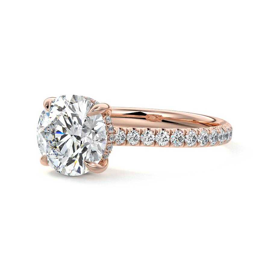 This exquisite engagement ring showcases a breathtaking Round cut lab-grown diamond, meticulously set atop a lustrous rose gold band adorned with pave-set diamonds. A discreet hidden halo beneath the center stone amplifies its brilliance, creating a radiant display of sparkle from every perspective.