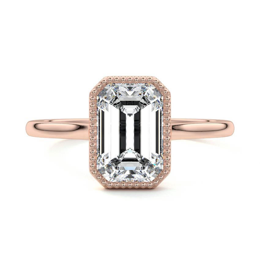 This exquisite engagement ring showcases a captivating Emerald cut lab grown diamond, beautifully encircled by a delicate halo featuring charming milgrain detailing. Its elegant design and vintage-inspired accents create a sophisticated and timeless piece, perfect for a grand romantic gesture.