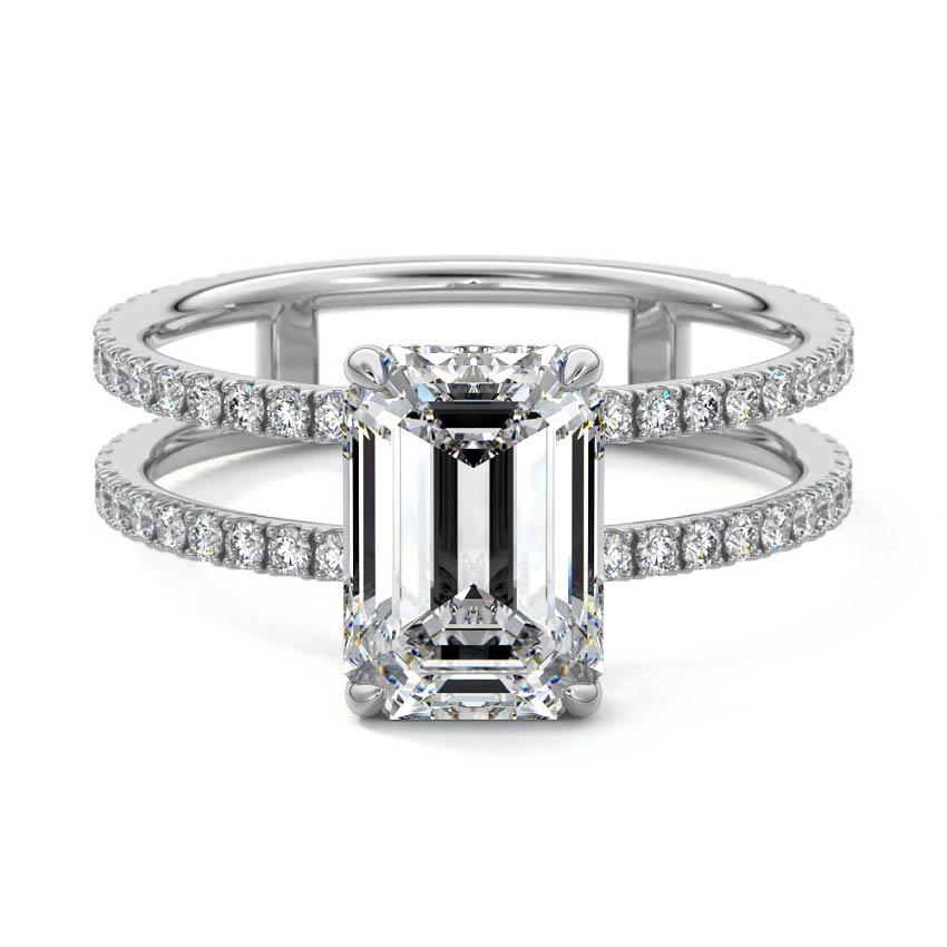 An exquisite Emerald cut lab grown diamond takes center stage, beautifully complemented by a double pave band. This ring design combines the sophisticated clarity of an Emerald cut with a touch of contemporary sparkle, perfect for those seeking modern elegance.