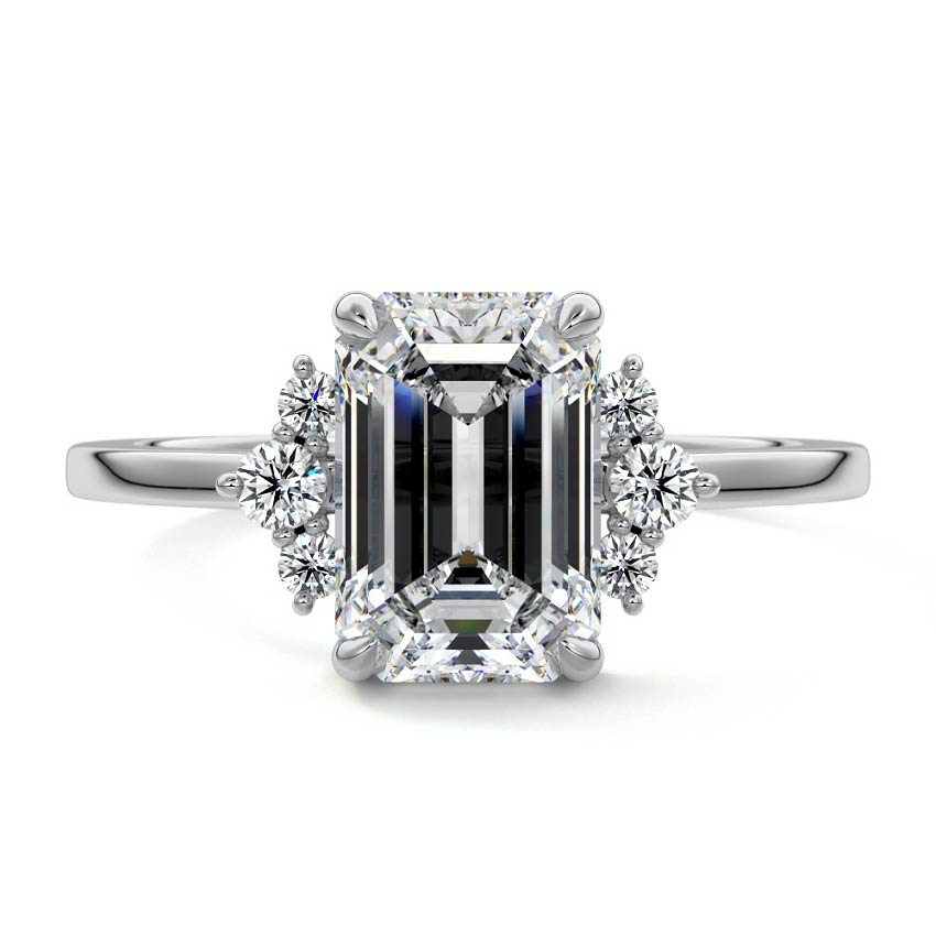 This captivating engagement ring features a stunning Emerald cut lab grown diamond, renowned for its elegant step-cut facets and rectangular silhouette. Accentuated by delicate clusters of brilliant sidestones, it offers a sophisticated blend of classic geometry and modern sparkle, set on a sleek band.
