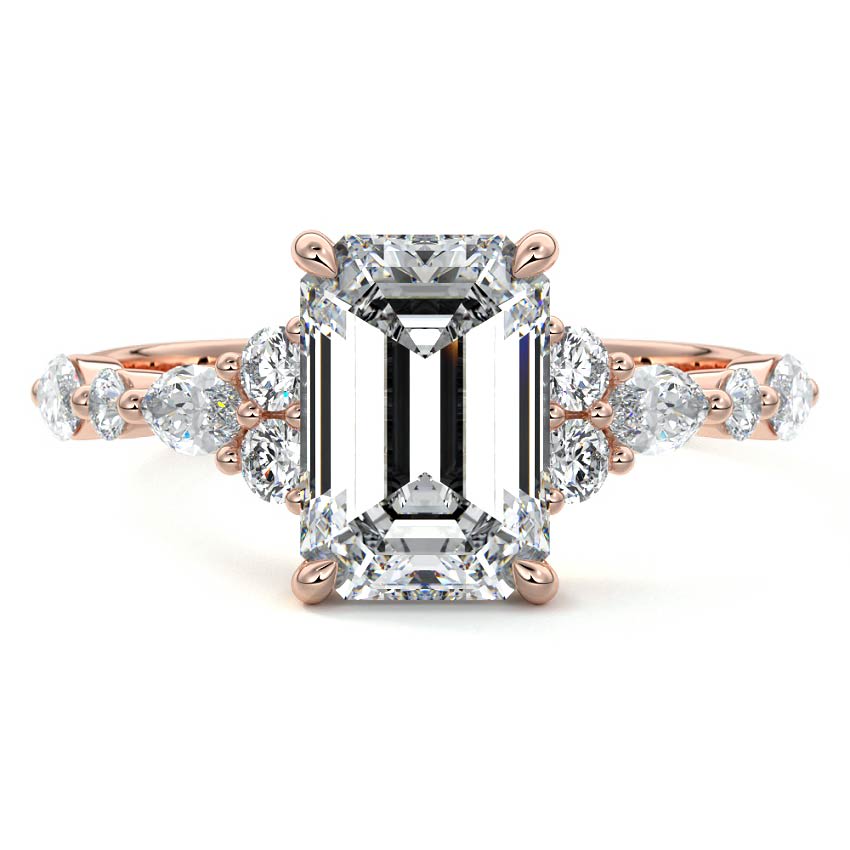 This captivating engagement ring features a magnificent emerald cut lab grown diamond, renowned for its sophisticated step-cut facets. Flanked by sparkling diamond clusters and a pave-set band, this design radiates timeless elegance and brilliance.
