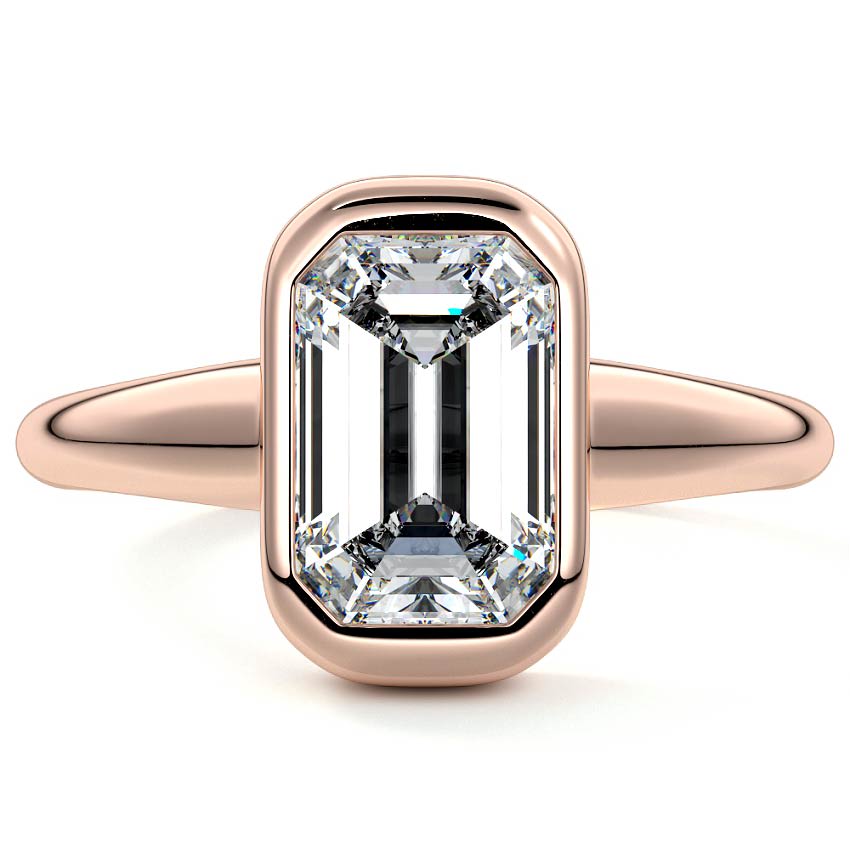 This exquisite engagement ring showcases a captivating Emerald cut lab grown diamond, meticulously set in a sleek bezel. Its minimalist solitaire design exudes a modern elegance, perfect for those who appreciate understated luxury.
