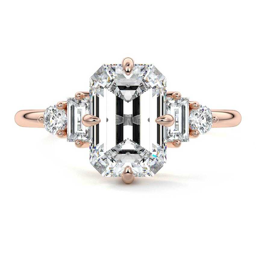 Showcasing a magnificent Emerald cut lab grown diamond at its heart, this three-stone engagement ring is flanked by two elegant baguette diamonds and two brilliant round sidestones. Its clean lines and refined design create a sophisticated and enduring statement of love.