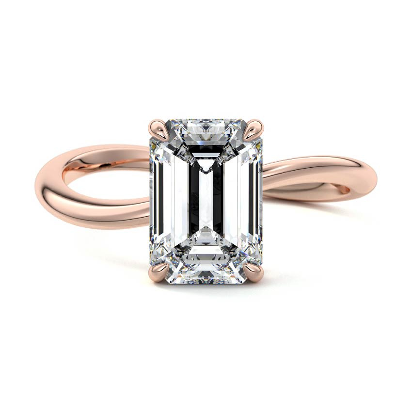 This captivating engagement ring features a stunning Emerald cut lab grown diamond, renowned for its elegant step-cut facets that create a sophisticated 'hall of mirrors' effect. Set gracefully atop a unique twisted band crafted in rose gold, this piece embodies modern elegance and distinctive style, making it a truly remarkable choice.