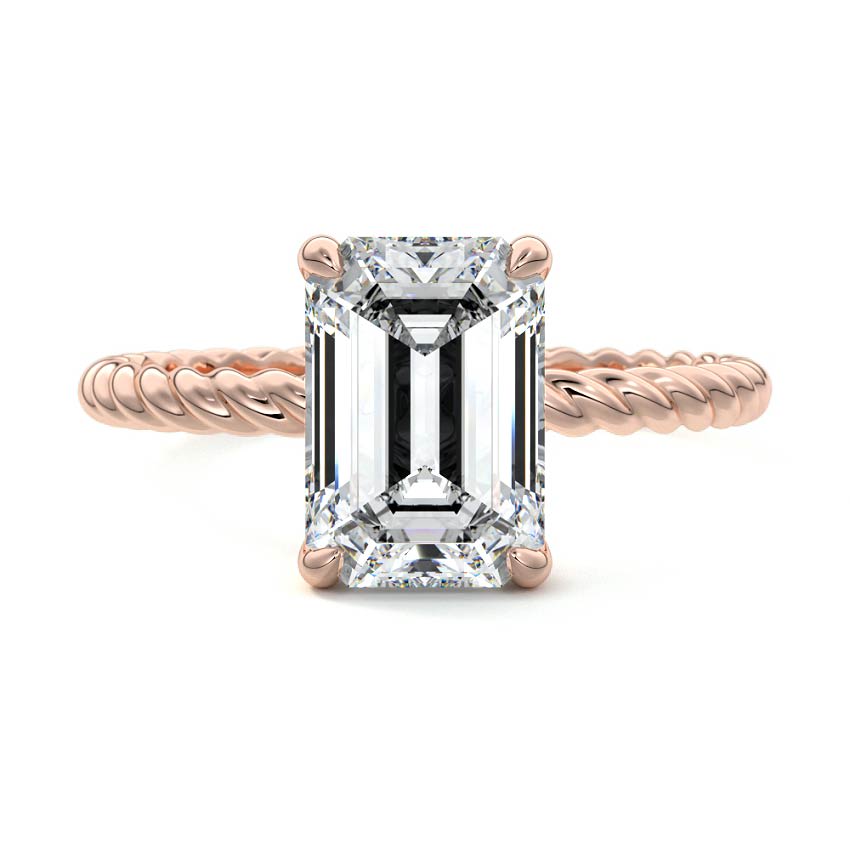 This exquisite engagement ring features a captivating Emerald cut lab grown diamond, renowned for its elegant step-cut facets and sophisticated rectangular silhouette. The stunning center stone is beautifully complemented by a unique twisted rose gold band, creating a modern yet timeless expression of love.