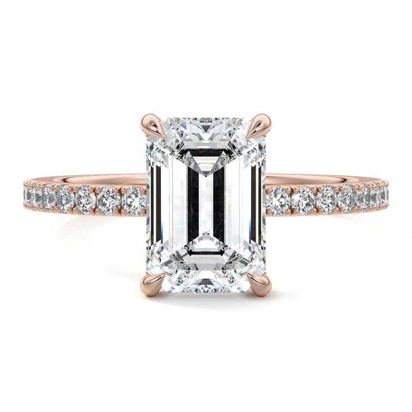 This exquisite Pave Emerald Cut Lab Grown Diamond Engagement Ring showcases a stunning Emerald cut center stone, renowned for its elegant, elongated step-cut facets. The brilliance of the center diamond is perfectly complemented by a delicate pave band, adding a captivating sparkle with every movement, creating a look of refined sophistication.