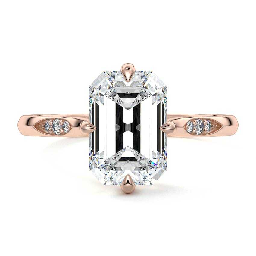 Showcasing a breathtaking Emerald cut lab grown diamond, this engagement ring exudes timeless sophistication with its step-cut facets creating a captivating 'hall of mirrors' effect. The elegant rose gold band is adorned with delicate sidestones, adding an extra touch of sparkle and allure to this exquisite piece.