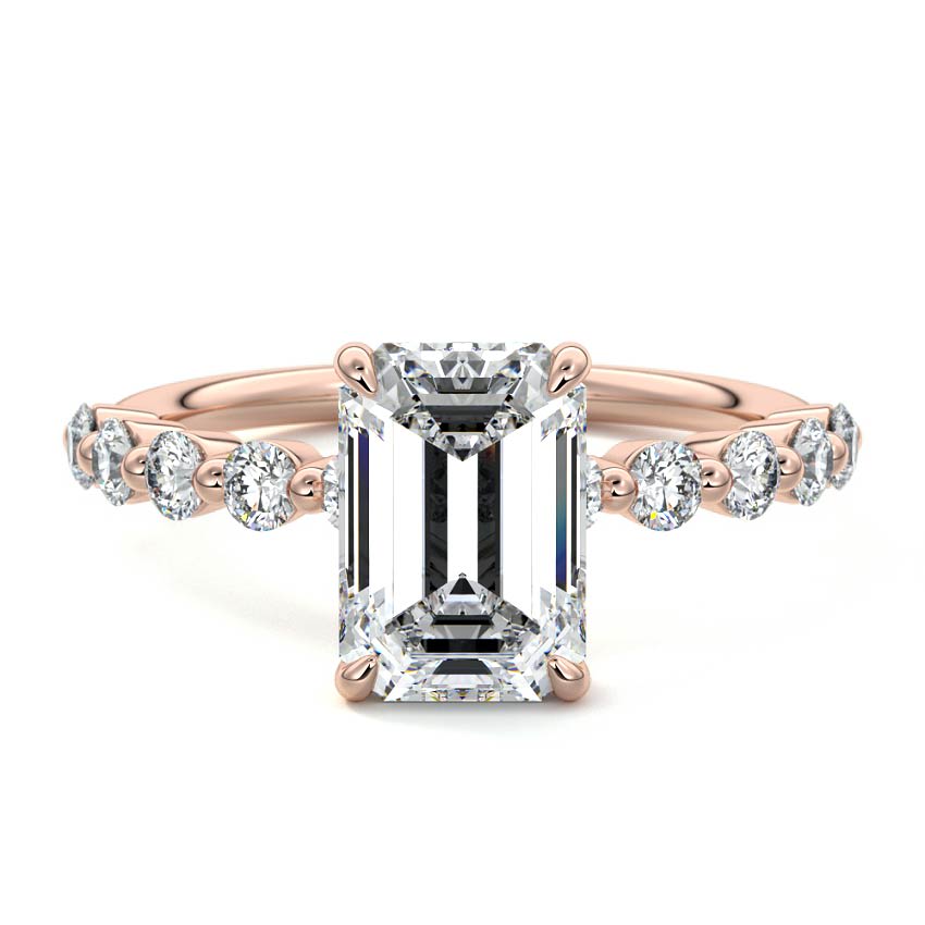 This exquisite engagement ring features a stunning Emerald cut lab grown diamond as its captivating center stone. The step-cut facets of the Emerald diamond create a sophisticated 'hall of mirrors' effect, perfectly complemented by the sparkling sidestones adorning the elegant rose gold band, offering a blend of modern design and timeless allure.