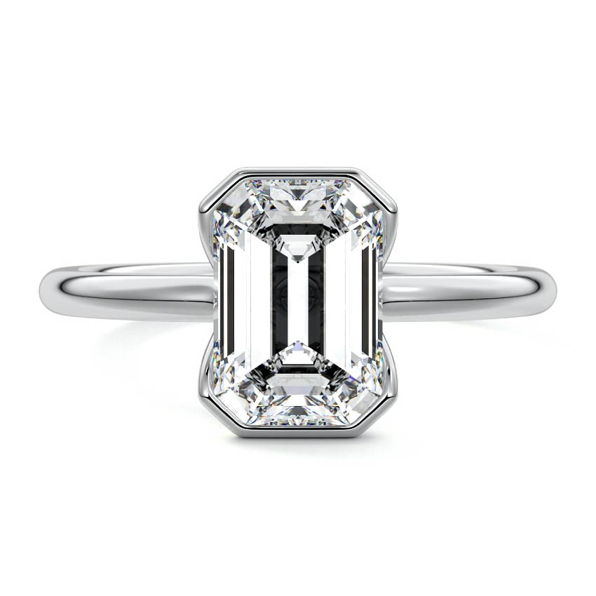 This exquisite solitaire engagement ring showcases a stunning Emerald cut lab grown diamond, bezel-set for a sleek and contemporary look. Its clean lines and elegant design offer a sophisticated statement of modern love.