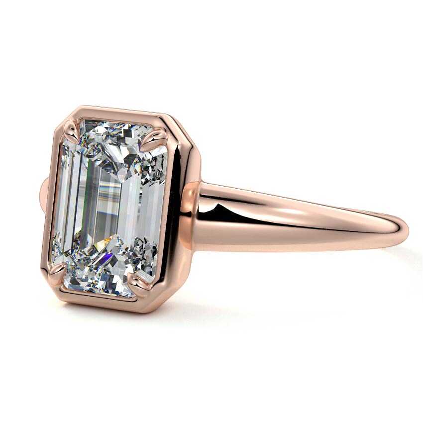 This exquisite solitaire engagement ring showcases a captivating emerald cut lab grown diamond. Set in a sleek bezel of polished rose gold, its minimalist design offers a sophisticated and modern aesthetic for a truly distinctive statement.