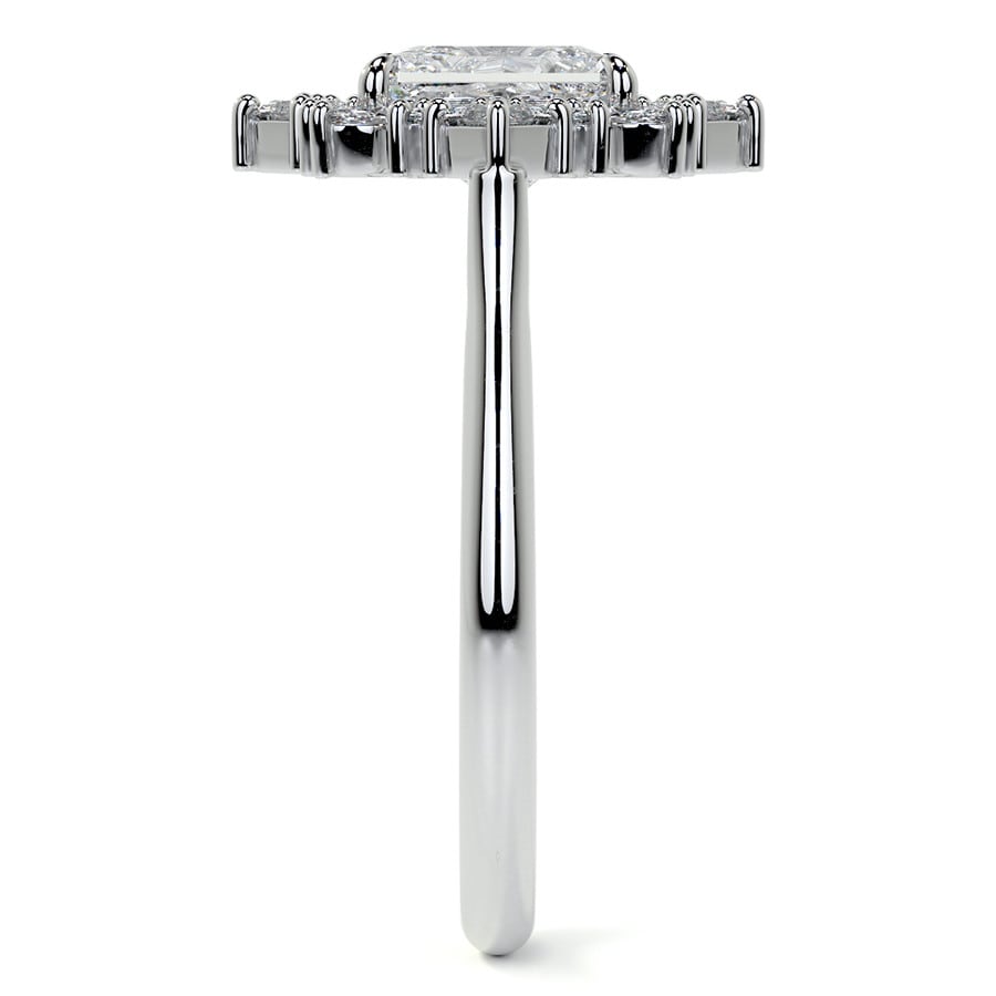 Showcasing a captivating emerald cut lab grown diamond at its heart, this ring features an intricate halo of meticulously arranged smaller diamonds, creating a breathtaking, bloom-like effect. The vintage-inspired design exudes timeless elegance and grand sophistication.