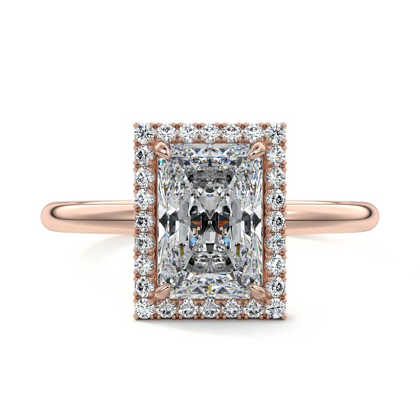 This stunning Halo Radiant Cut Lab Grown Diamond Engagement Ring showcases exceptional brilliance, with a captivating rectangular center stone featuring beautifully cropped corners. Encircling the radiant diamond, a dazzling halo of smaller stones enhances its sparkle and creates a magnificent display of light, embodying modern elegance.