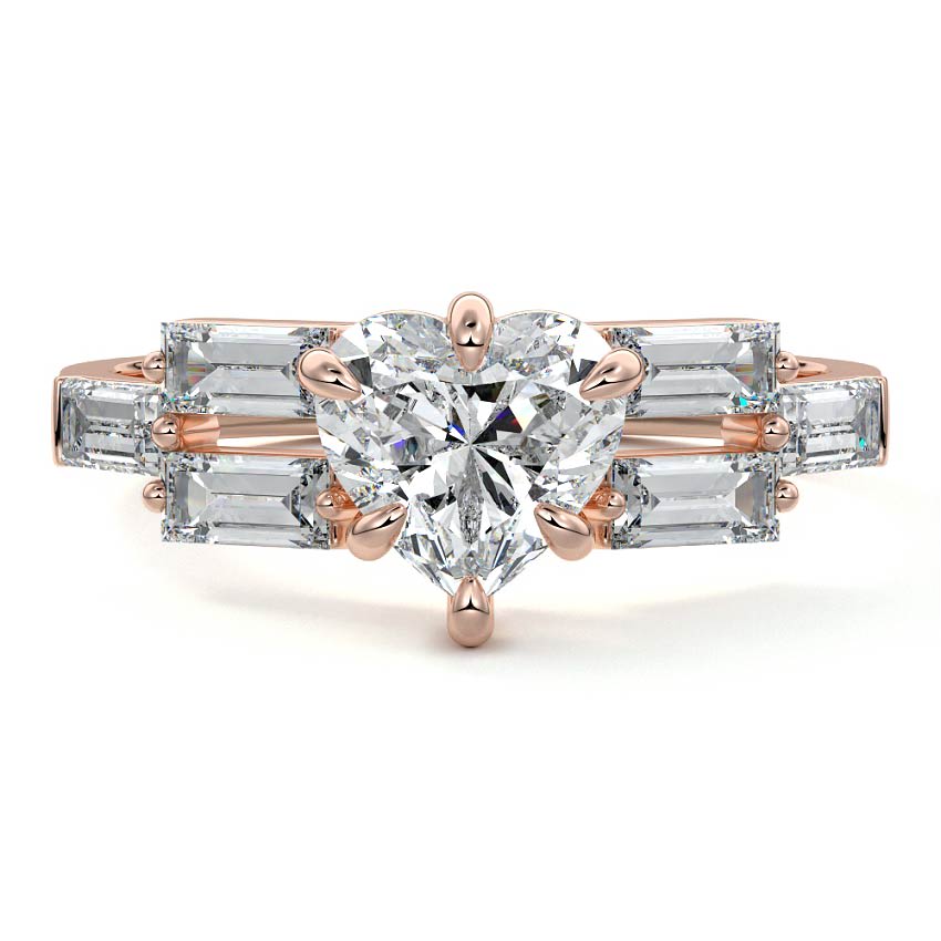 This exquisite engagement ring showcases a captivating Heart cut lab grown diamond, radiating romantic brilliance. It is elegantly flanked by graduated baguette side stones, creating a sophisticated and unique silhouette that speaks of timeless love.