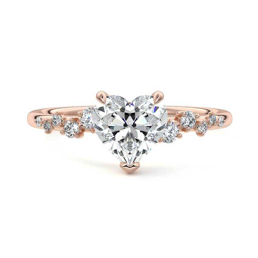 This exquisite engagement ring features a captivating Heart cut lab grown diamond, symbolizing enduring love. Adorned with delicate sidestones gracefully scattering along the band, it evokes a sense of nature-inspired elegance and romance, perfect for a heartfelt proposal.