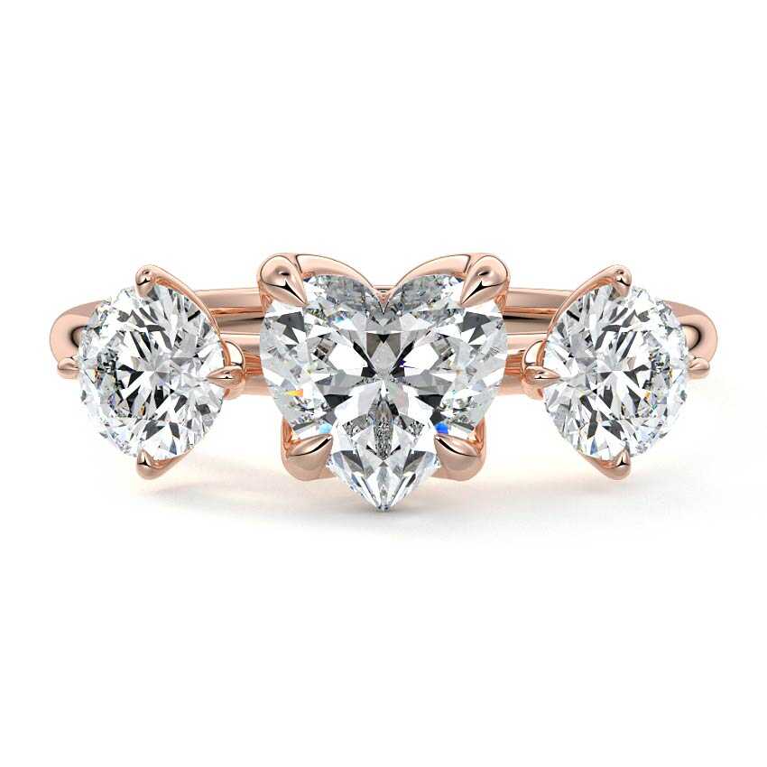 This exquisite three stone engagement ring features a captivating heart-cut lab grown diamond at its center, flanked by two brilliant round side stones. Set in a polished metal band, it creates a romantic and sparkling statement of affection.