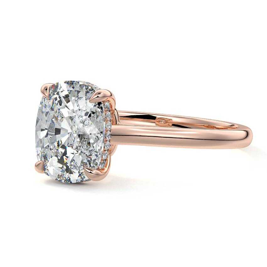 This exquisite engagement ring features a stunning Cushion cut lab grown diamond, radiating brilliant sparkle. Adorned with a delicate hidden halo of smaller diamonds, it offers a sophisticated and timeless elegance, perfect for a lasting commitment.