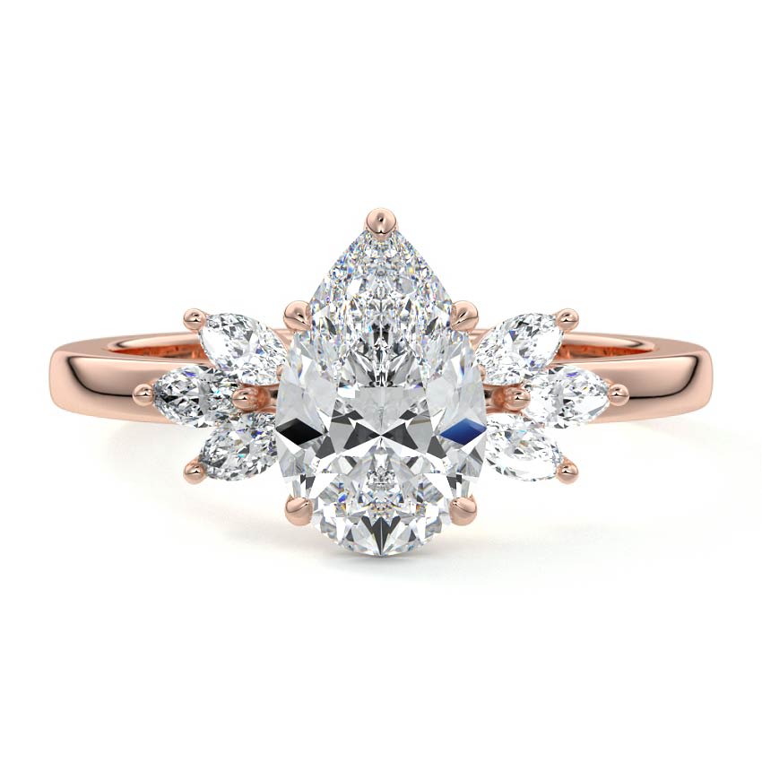 This captivating engagement ring features a brilliant pear-cut lab grown diamond, elegantly framed by intricate clusters of smaller pear-shaped diamonds, reminiscent of delicate petals. Set on a polished band, this design embodies timeless romance with a unique, nature-inspired touch.