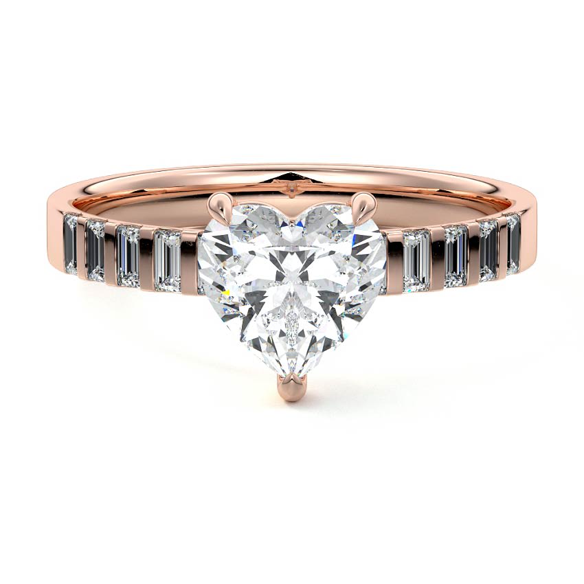 This exquisite ring features a brilliant heart-shaped lab-grown diamond, a perfect symbol of enduring love. The elegant rose gold band is adorned with shimmering baguette sidestones, adding a sophisticated and unique touch.