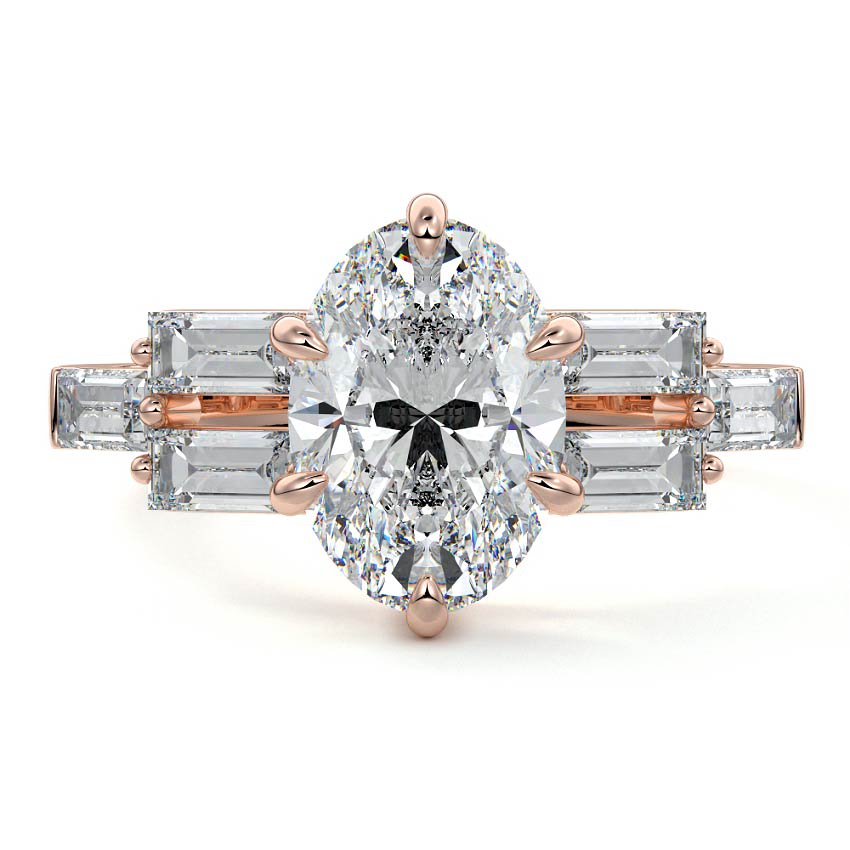 This exquisite engagement ring features a stunning Oval cut lab grown diamond, captivating with its elongated brilliance. It is elegantly flanked by a sophisticated arrangement of baguette side stones, creating a modern yet timeless appeal.
