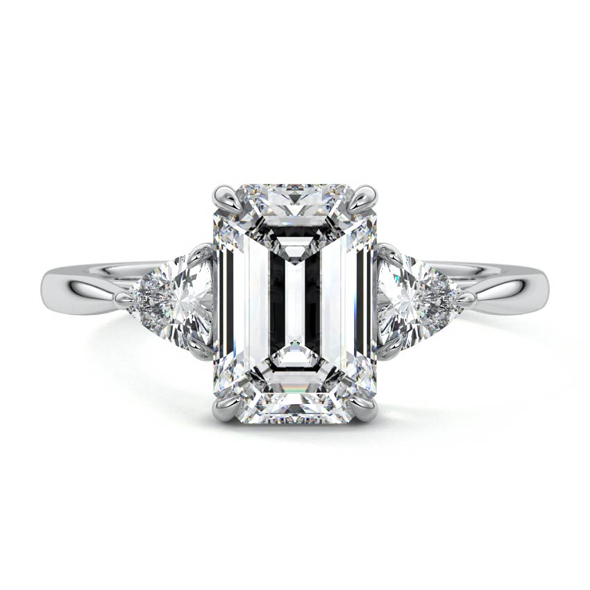 Experience the captivating allure of this three-stone engagement ring, showcasing a mesmerizing Emerald cut lab-grown diamond at its heart. Flanked by elegant pear-shaped side stones, this design exudes a refined sophistication and distinctive brilliance that makes a timeless statement.