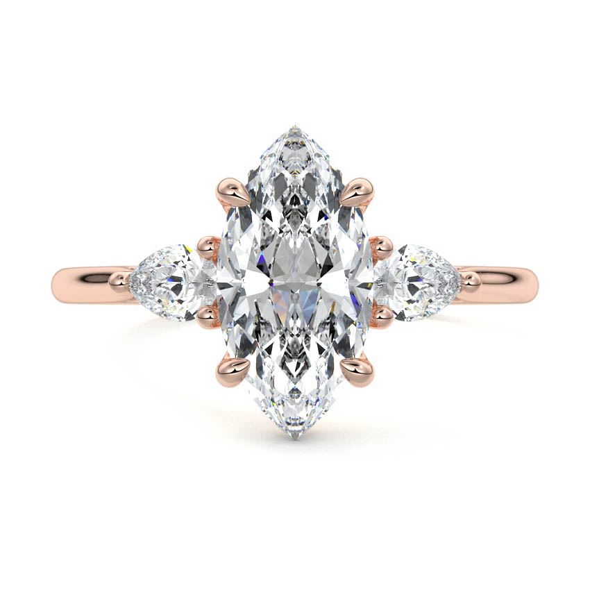 This exquisite engagement ring features a stunning Marquise cut lab grown diamond as its captivating center stone. Flanked by two elegant pear-shaped side stones, the three-stone design creates a brilliant and balanced display of sparkle, set on a graceful band.