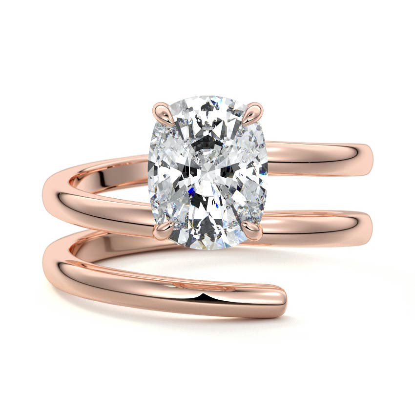 This captivating engagement ring features a brilliant cushion cut lab grown diamond, elegantly set atop a unique twisted rose gold band. Its modern spiral design embodies sophisticated style and individuality, making a distinctive statement.