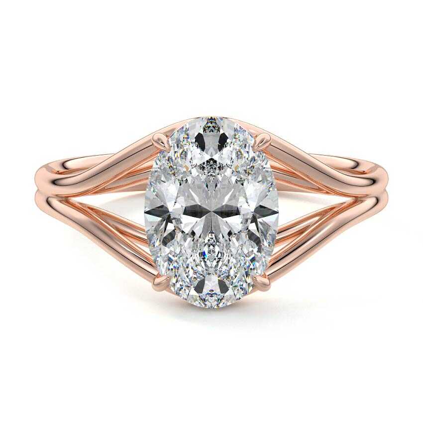 This exquisite engagement ring features a stunning oval cut lab grown diamond, captivating with its elongated brilliance. The graceful center stone is beautifully cradled by a distinctive twisted rose gold band, creating a captivating symbol of enduring love with modern elegance.