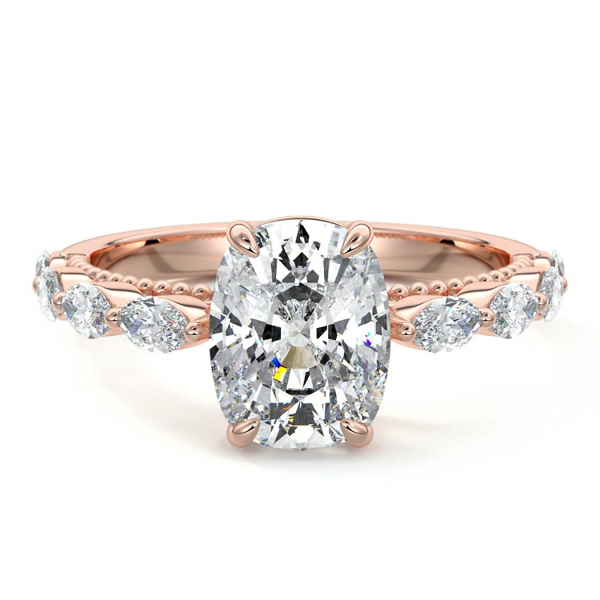 This exquisite vintage-inspired engagement ring features a stunning elongated Cushion cut lab grown diamond as its radiant center. Delicately framed by intricate milgrain detailing and marquise-shaped accent diamonds along the band, this ring captures a timeless allure with its unique and sophisticated design.