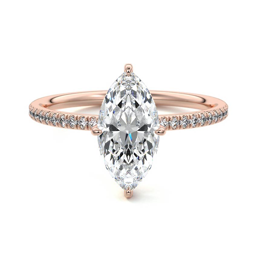 This exquisite pave engagement ring showcases a stunning Marquise cut lab-grown diamond, celebrated for its elongated, eye-catching silhouette and brilliant sparkle. The slender band, adorned with shimmering pave-set diamonds, enhances the center stone's elegance and creates a dazzling display of light.