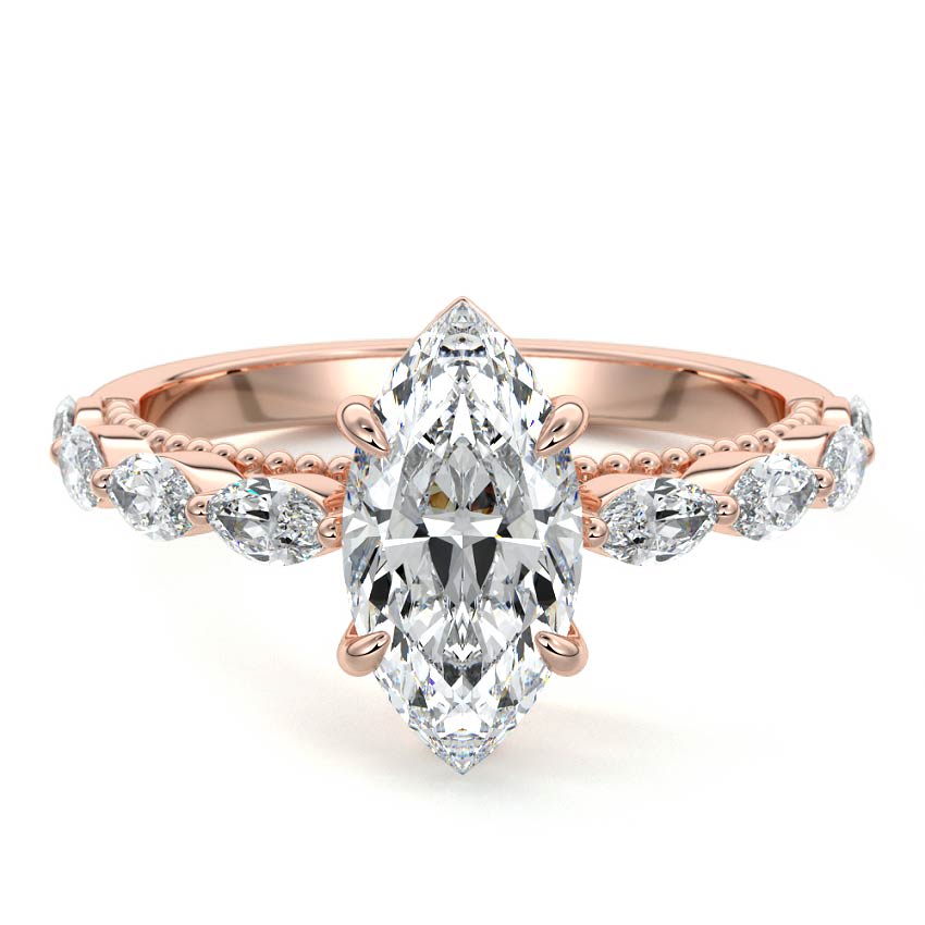 This exquisite engagement ring features a stunning Marquise cut lab grown diamond at its center, showcasing an elongated silhouette with two elegant pointed ends. The rose gold band is beautifully enhanced with marquise sidestones and delicate milgrain detailing, creating a captivating vintage-inspired design.