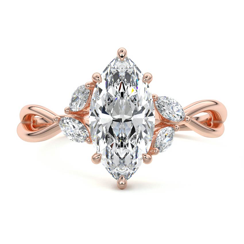 This enchanting engagement ring features a dazzling Pear cut lab grown diamond, elegantly set amidst a flurry of marquise-shaped side stones that blossom like delicate leaves. The design is further enhanced by a beautifully twisted band, creating a piece that exudes organic charm and sophisticated brilliance.