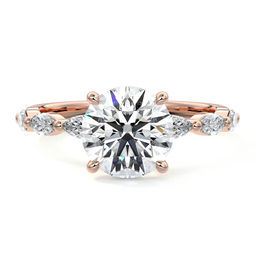 This captivating engagement ring features a brilliant Round cut lab grown diamond, exuding classic elegance and breathtaking sparkle. Its unique rose gold band is adorned with nature-inspired marquise and pear-shaped accents, creating a harmonious and enchanting design that celebrates organic beauty.