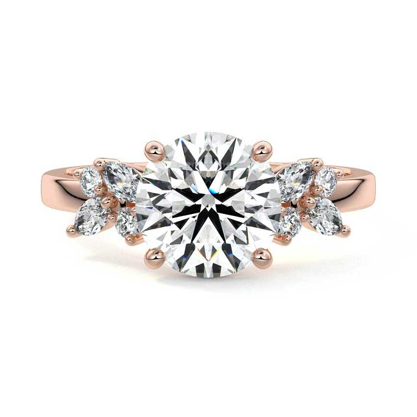 This enchanting engagement ring showcases a captivating round cut lab grown diamond, elegantly complemented by nature-inspired clusters of marquise and round sidestones. Crafted to evoke the delicate beauty of a blooming flower, it offers a unique and timeless appeal.