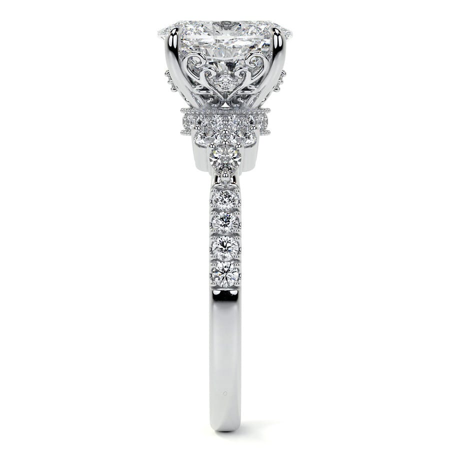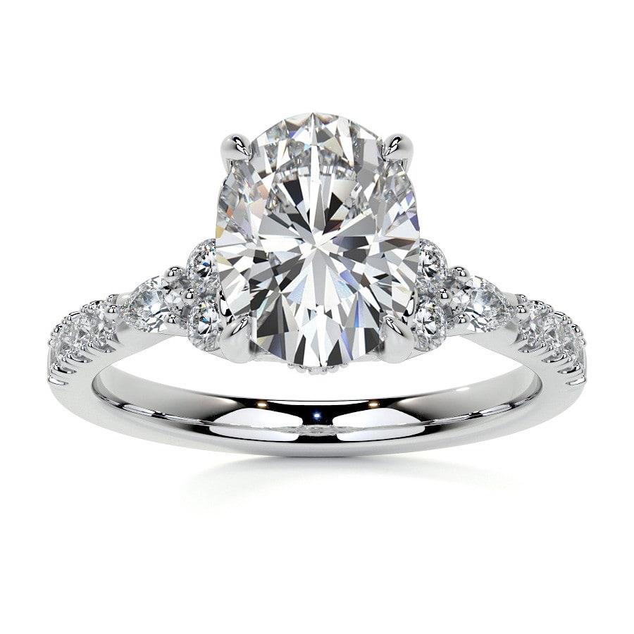This exquisite engagement ring showcases a captivating oval cut lab grown diamond as its magnificent centerpiece. Its graceful silhouette is beautifully complemented by sparkling sidestones that adorn the band, creating a design of refined elegance and timeless appeal.